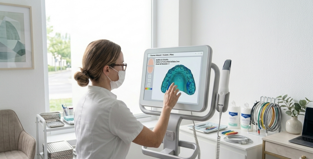 La tecnología ha sustituido los antiguos moldes de masilla por soluciones digitales mucho más avanzadas. El escáner intraoral permite capturar imágenes precisas de dientes y encías en cuestión de segundos. Con este sistema: